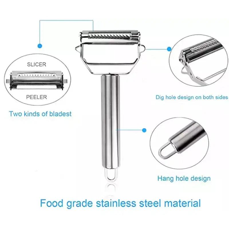 The Peeler Multifunctional Stainless Steel Super Sharp Dual Julienne Rotating Potato Fruit Vegetable Peeler is a versatile kitchen tool designed for efficiently peeling and julienning a variety of fruits and vegetables.
